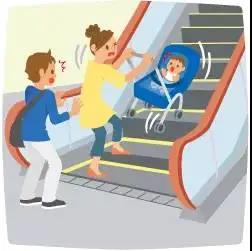 11婴儿车上扶梯是非常危险的,车轮搞不好就会导致婴儿车失去平衡,这是非常危险的,千万不要这样做!